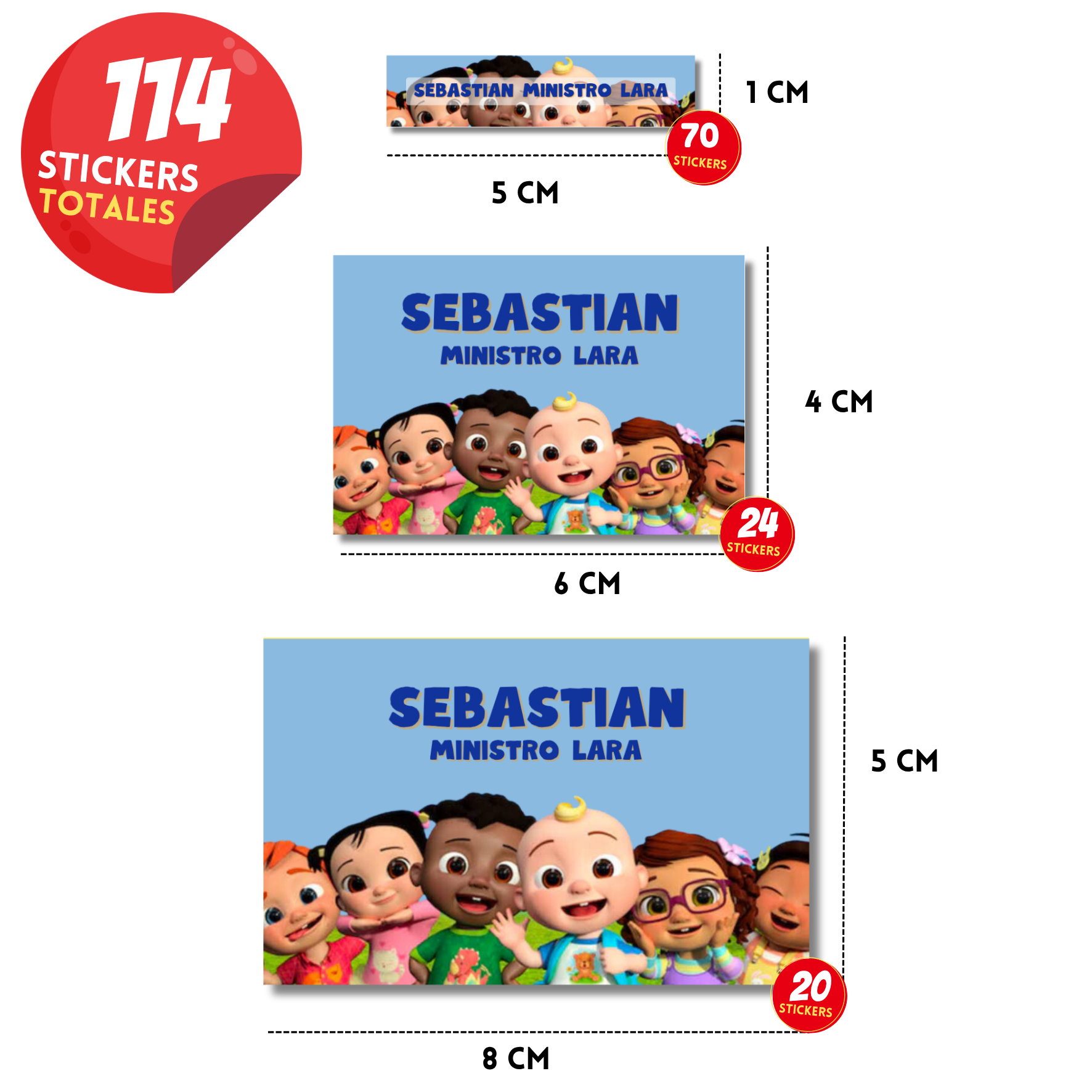 Cocomelon & Amigos Etiquetas Escolares Personalizadas Libretas, Libros y Lápices