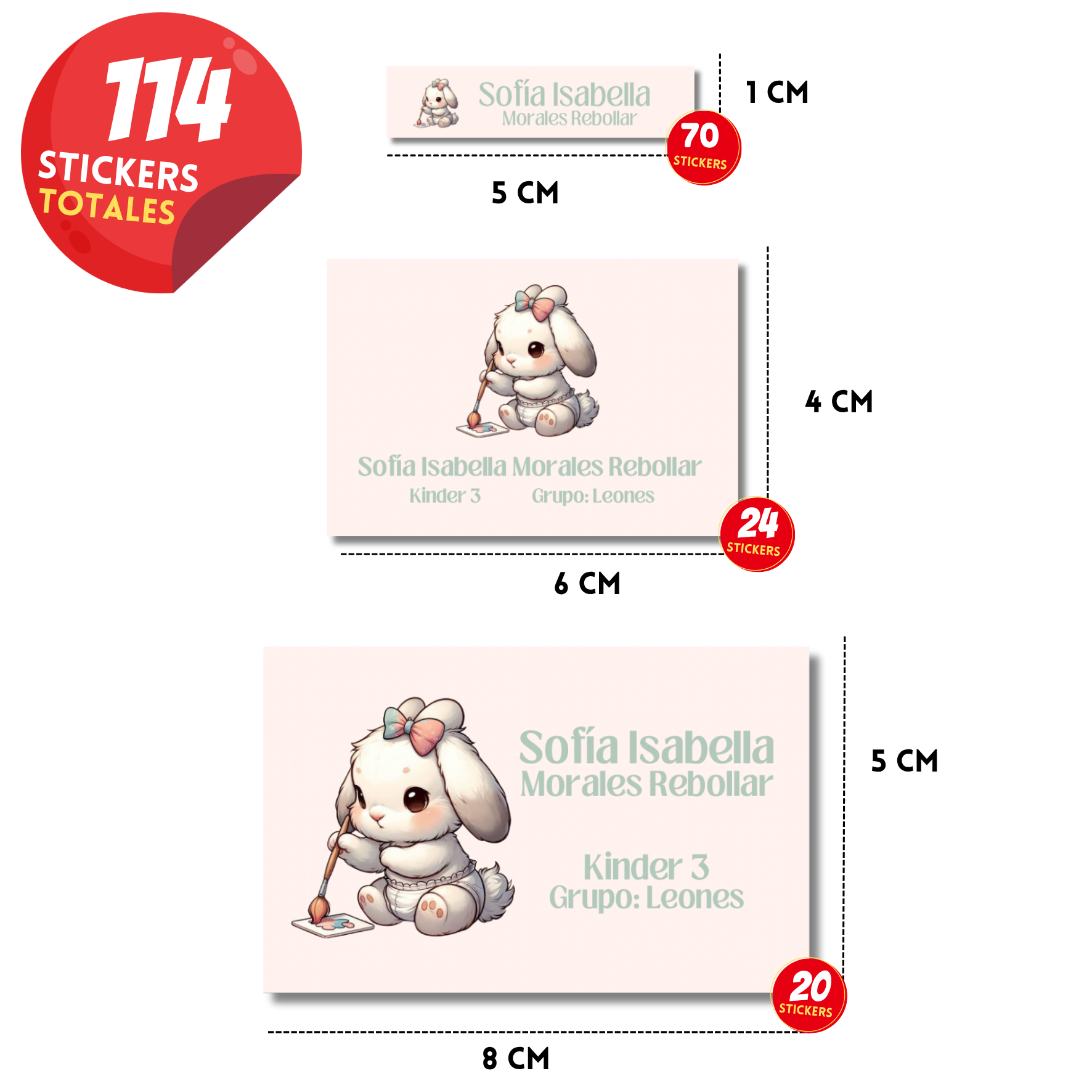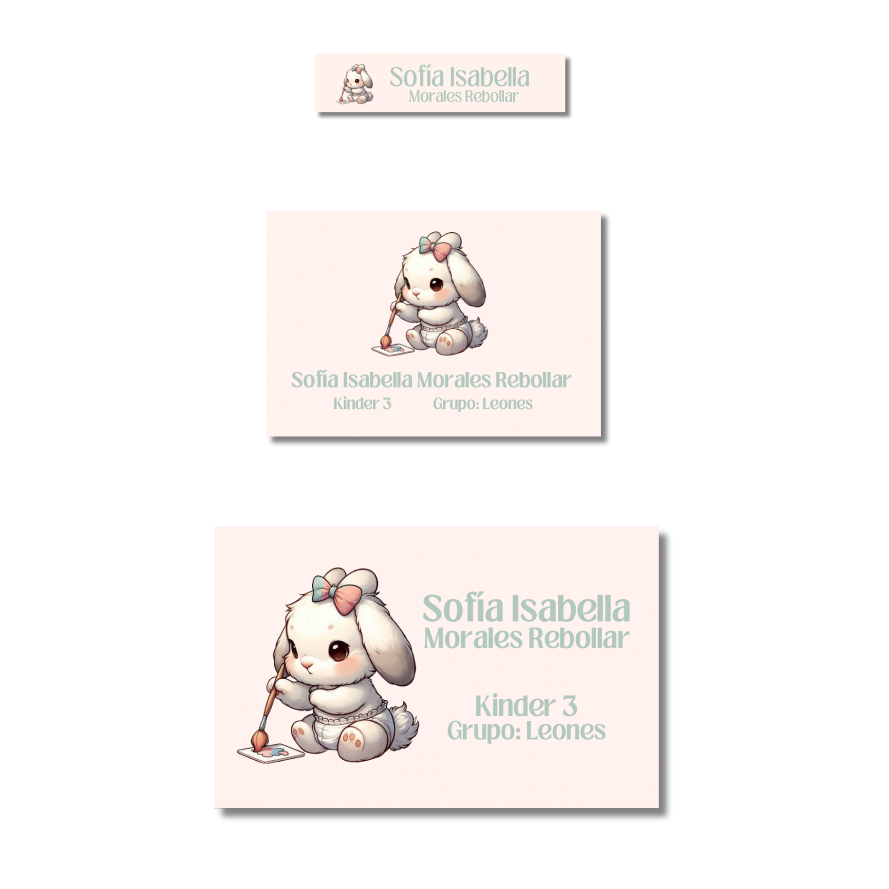 Conejita Pintando fondo rosa claro Etiquetas Escolares Personalizadas Libretas, Libros y Lápices