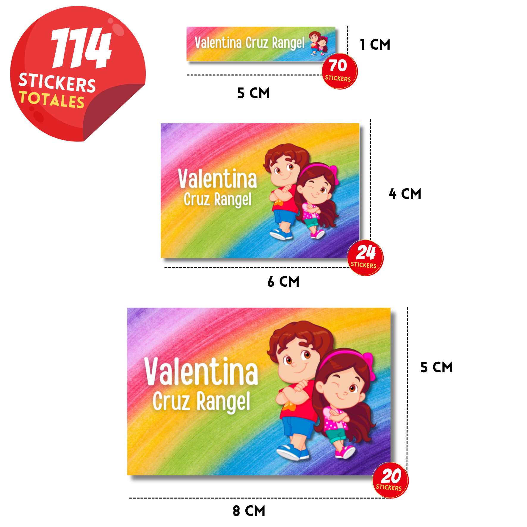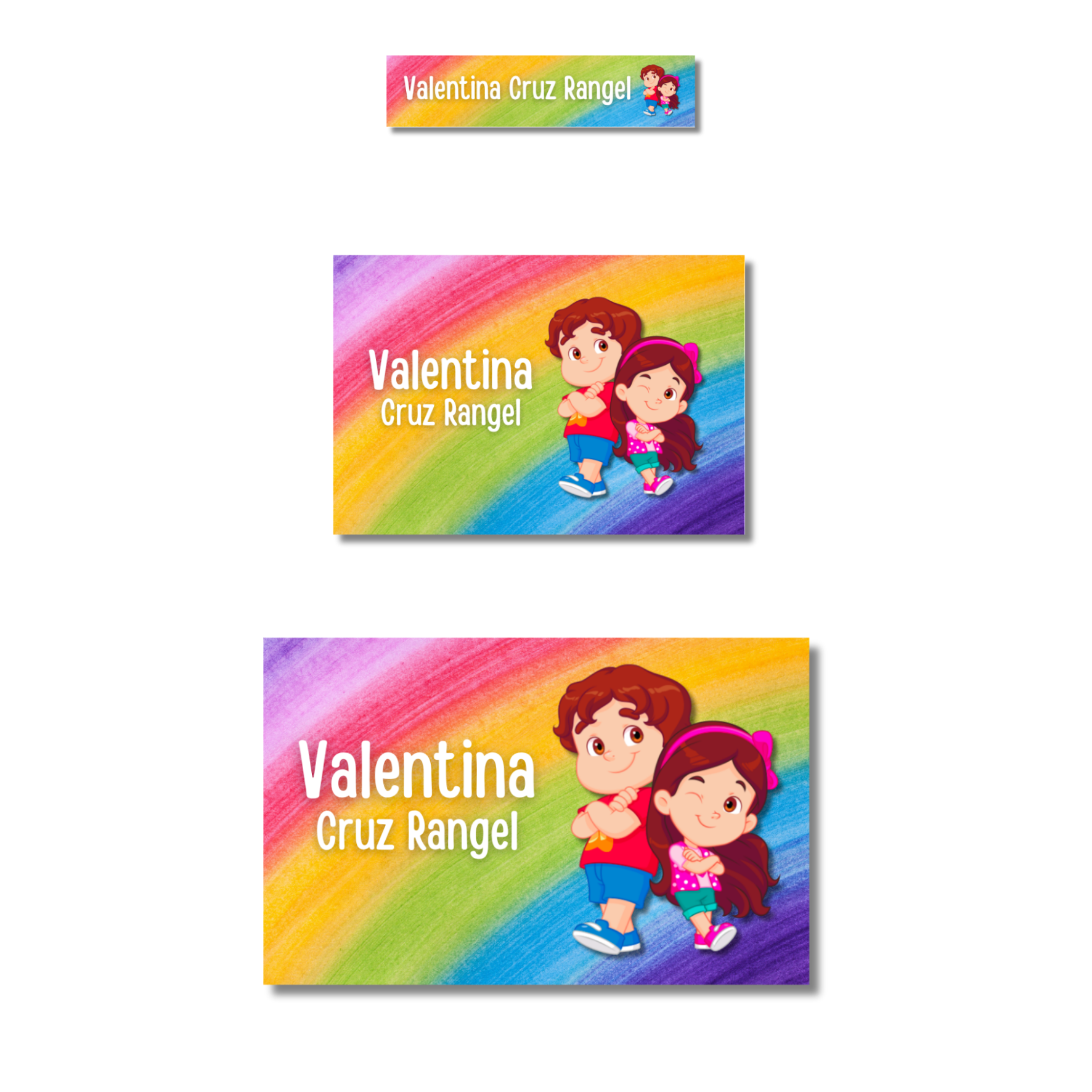 María Clara & JP Arcoíris Etiquetas Escolares Personalizadas Libretas, Libros y Lápices